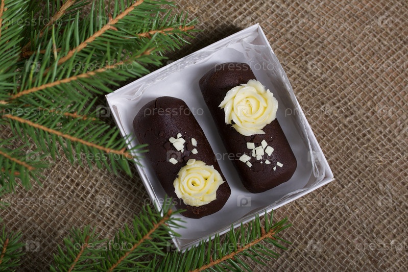 Пирожное картошка Украшен сливочным кремом. В подарочной коробке. На льняном фоне. Рядом с еловой веткой. Снято крупным планом