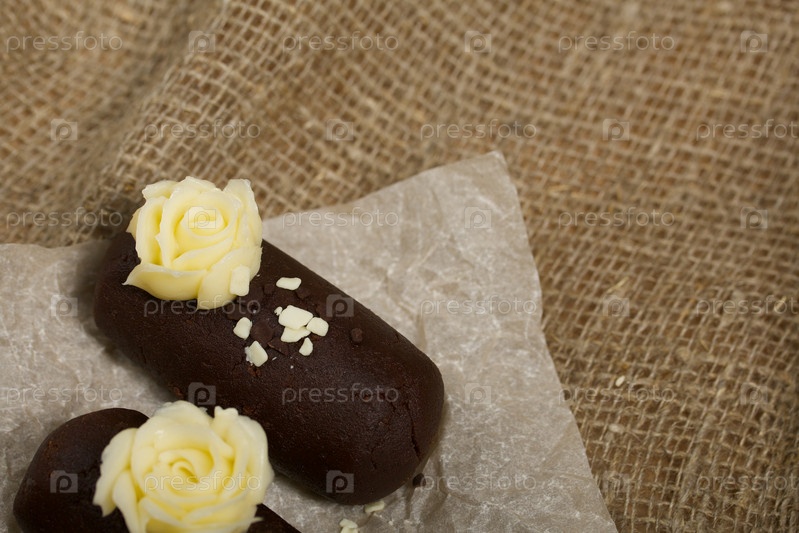 Пирожное картошка. Украшен сливочным кремом. На льняном фоне. Снято крупным планом