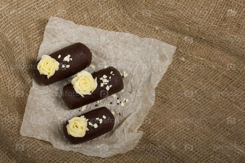 Пирожное картошка. Украшен сливочным кремом. На льняном фоне. Снято крупным планом
