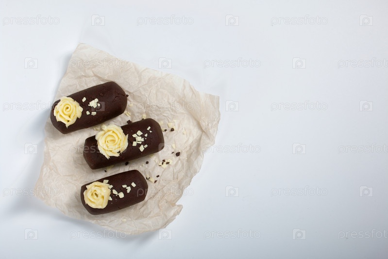Торт картофельный. Украшен сливочным кремом. На белом фоне. Снято крупным планом