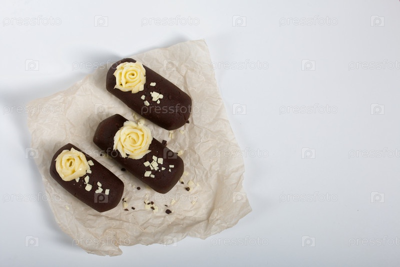 Торт картофельный. Украшен сливочным кремом. На белом фоне. Снято крупным планом