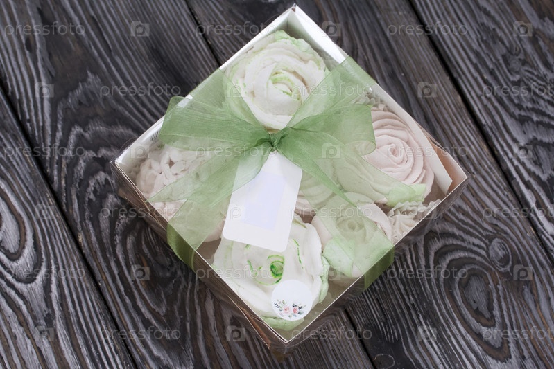 Домашний зефир в подарочной упаковке. Перевязан лентой. Зефир цветы. На черных сосновых досках. Взято сверху