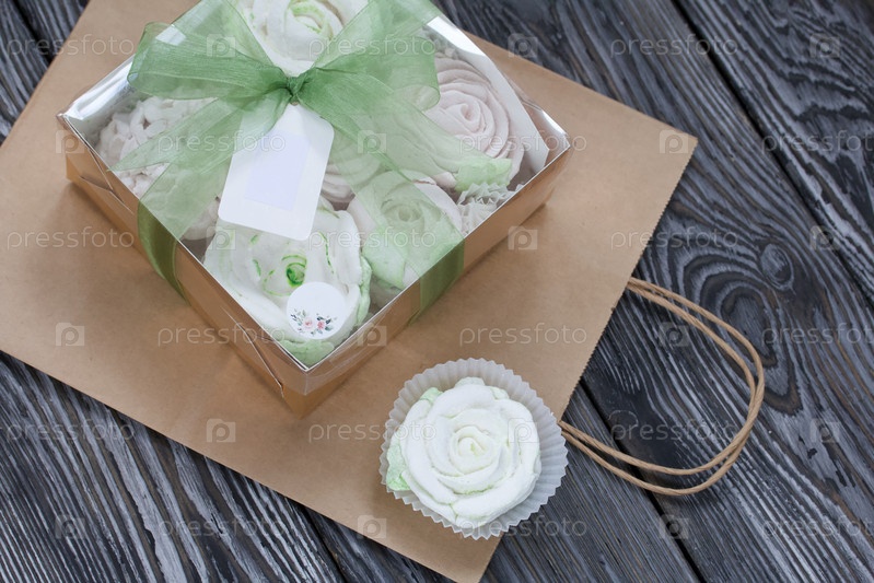 Домашний зефир в подарочной упаковке. Перевязан лентой. Бумажный пакет из крафтовой бумаги. Зефир цветы. На черных сосновых досках. Взято сверху