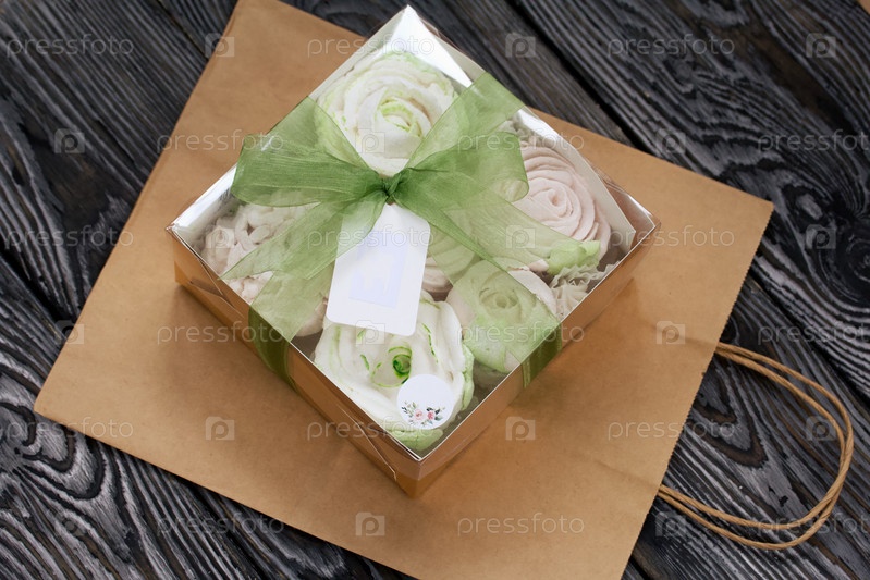 Домашний зефир в подарочной упаковке. Перевязан лентой. Бумажный пакет из крафтовой бумаги. Зефир цветы. На черных сосновых досках. Взято сверху