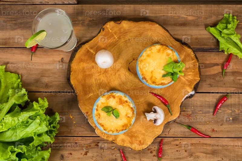Горшки с жульеном из грибов на деревянной доске. Вид сверху