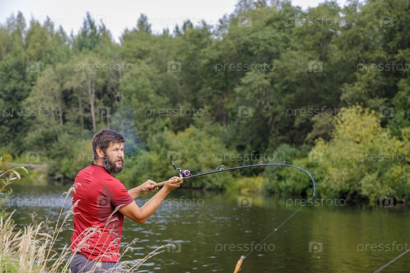 Мужчина с бородой ловит рыбу на реке, забрасывает удочку