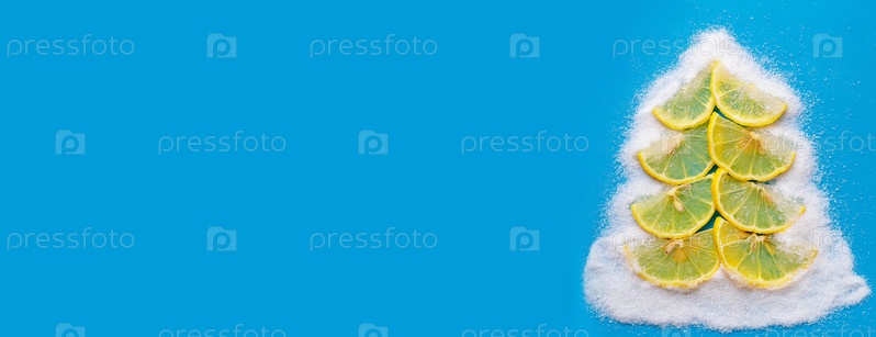 Рождественская елка из лимона и сахарных фруктов на синем фоне. Место для текста