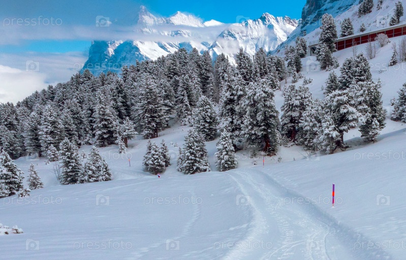 Красивый зимний горный пейзаж в солнечную погоду с видом на горную вершину Веттерхорн 3692 м. Гриндельвальд, Бернский Оберланд, Швейцария