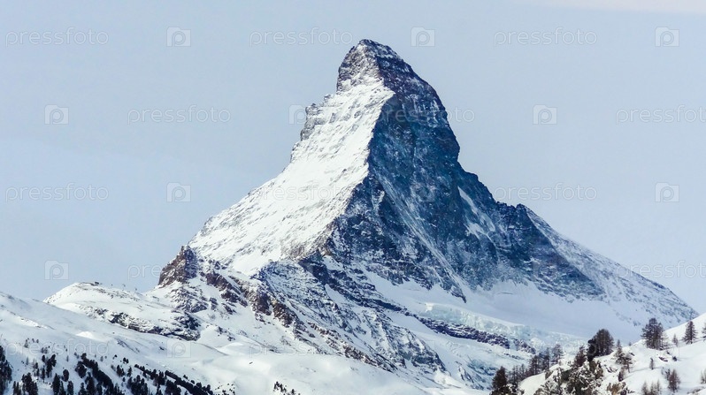 Культовая эмблема швейцарских Альп – Маттерхорн высотой 4478 метров. это гора в Альпах на границе Швейцарии и Италии. зимний пейзаж
