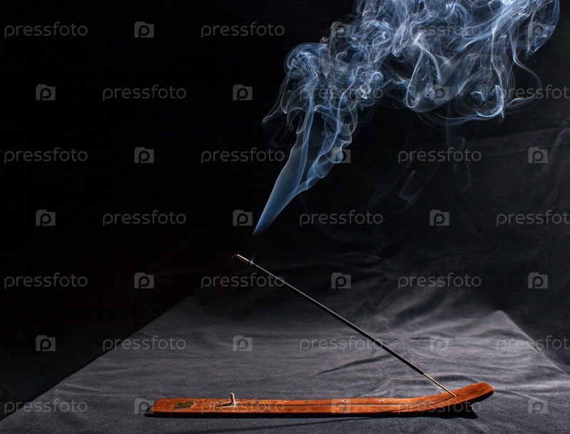 Индийская ароматическая палочка с дымом на черном фоне в помещении крупным планом