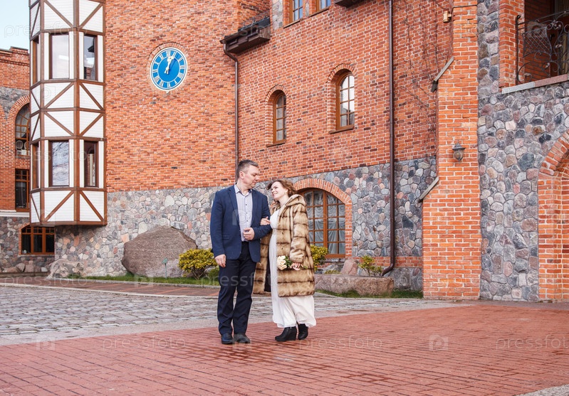 Молодожены возле замка на прогулке в парке