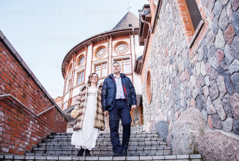 Пара молодоженов гуляет возле старого замка