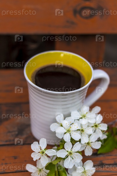 Чашка кофе на темном изношенном деревенском деревянном столе. Композиция украшена веточкой с белыми цветами. Цветы вишневого дерева. Выборочный фокус
