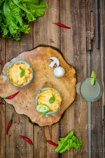 Горшки с жульеном из грибов на деревянной доске. Вид сверху