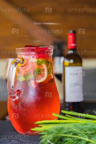 Обед с графином охлажденного красного морса с дольками лимона. Бутылка вина и травы