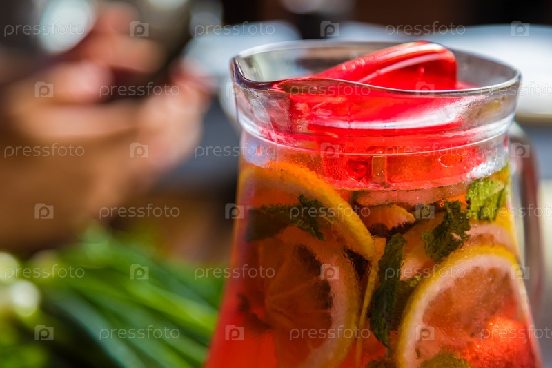 Обед с графином охлажденного красного морса с дольками лимона и мяты