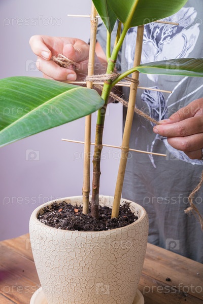Женщина привязывает веревкой к цветку фикуса опору. Цветоводство