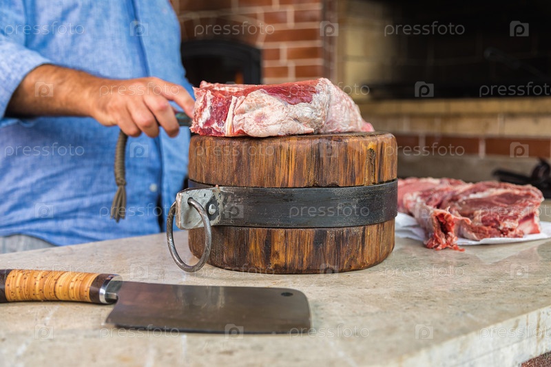 Мужчина режет сырое мясо на палубе. Свежее мясо на разделочной доске