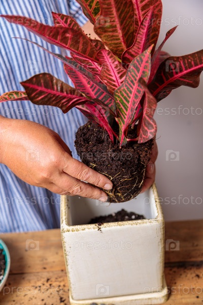 Женщина пересаживает комнатное растение, цветок в керамический горшок