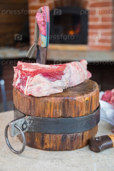 Сырое мясо на палубе, нож воткнулся в мясо. Свежее мясо на разделочной доске
