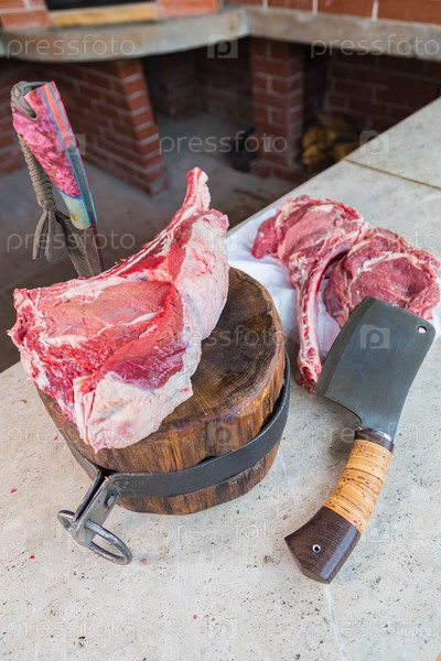 Сырое мясо на палубе, нож воткнулся в мясо. Свежее мясо на разделочной доске