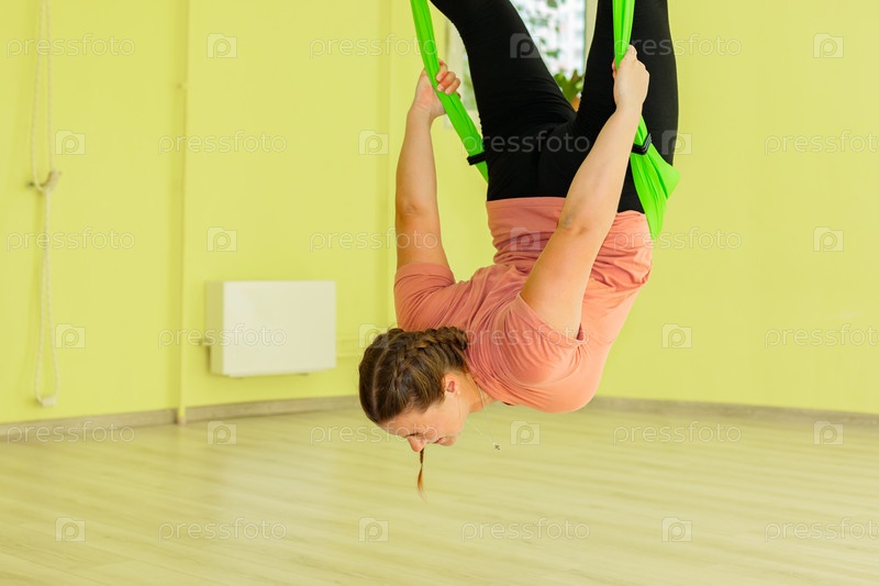 Молодая девушка занимается йогой в гамаке в холле. Девушка выполняет асаны в подвешенном состоянии