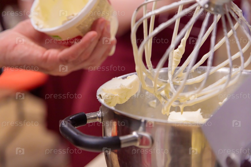 Приготовление тирамису из крема маскапоне взбить в сотейнике. Крупный план