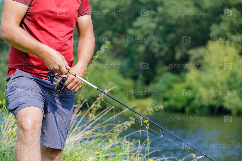 Мужчина с бородой ловит рыбу на реке. Рыбак с удочкой ловит рыбу на берегу реки
