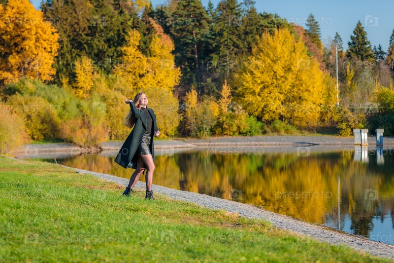 Женщина с длинными волосами гуляет в осеннем парке у пруда и бросает камни в воду. Осенний сезон