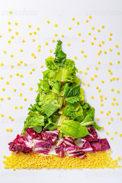 Елка из продуктов зеленого салата, капусты, сырых макарон. Вид сверху