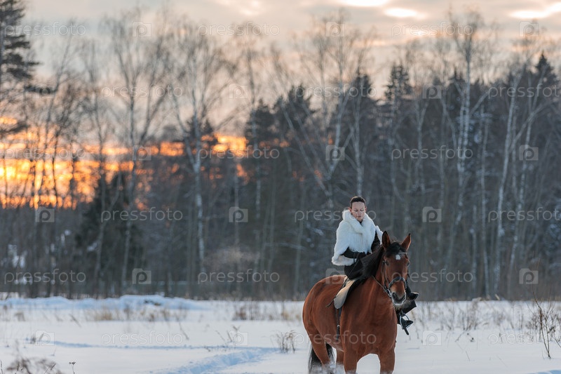 Девушка в белом плаще едет зимой на коричневой лошади