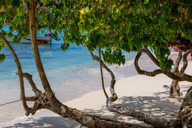 Морской берег с большими растущими деревьями. Лодка в море. Фото высокого качества