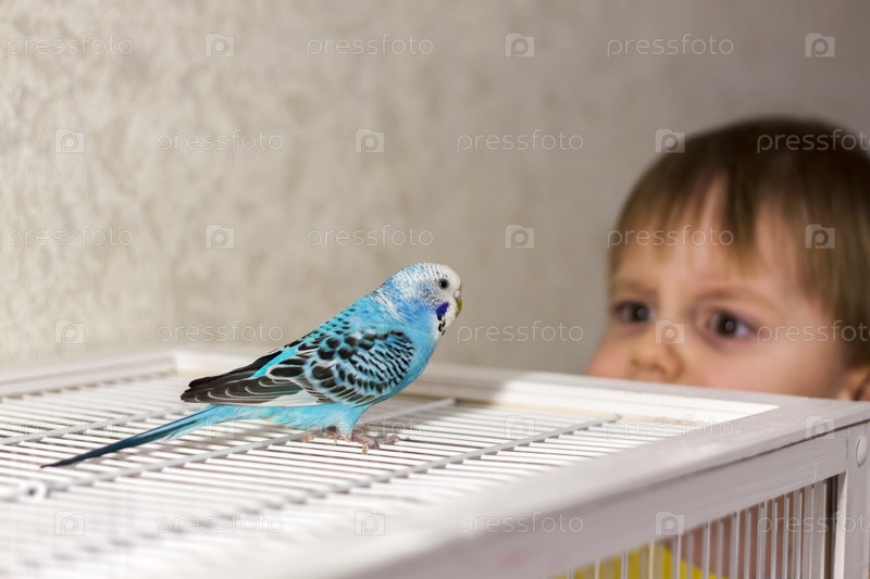 Красивый голубой волнистый попугайчик сидит без клетки. Тропические птицы дома