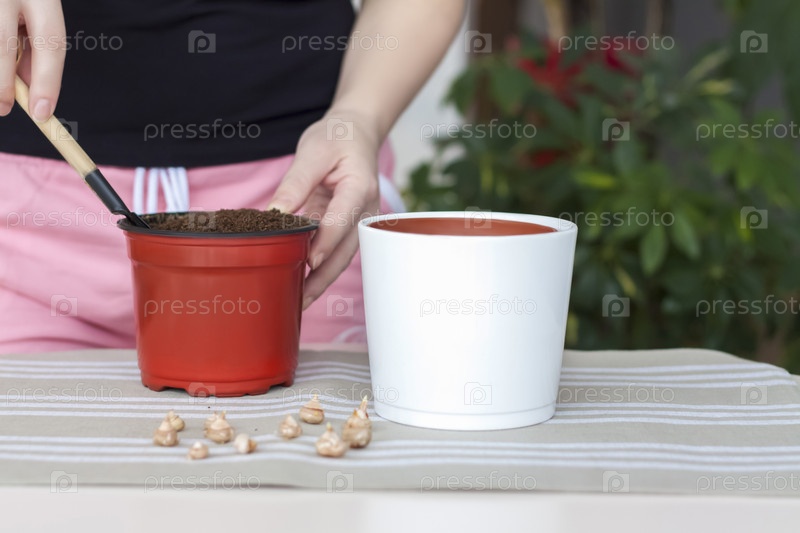 Девушка сажает цветочные луковицы в землю в горшке