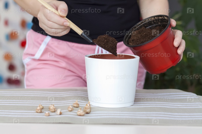 Девушка сажает цветочные луковицы в землю в горшке. Сажать цветы. Растет дома