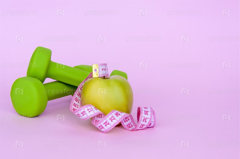 Зеленое яблоко и сантиметровая лента на розовом фоне. Спорт, спортивное питание, здоровое питание, диета. Место для текста