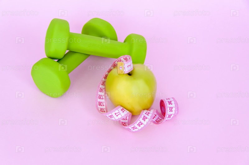 Зеленое яблоко и сантиметровая лента на розовом фоне. Спорт, спортивное питание, здоровое питание, диета. Место для текста