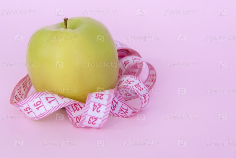 Зеленое яблоко и сантиметровая лента на розовом фоне. Спорт, спортивное питание, здоровое питание, диета. Место для текста