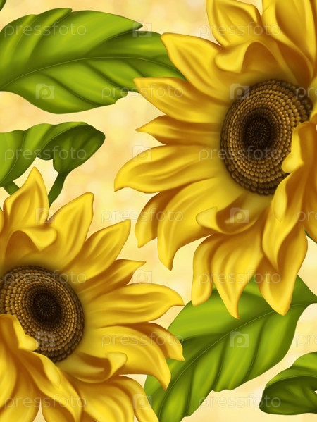 Иллюстрация подсолнухов. Фон для оформления открытки. Иллюстрация цветов. Яркие цветы на светлом фоне