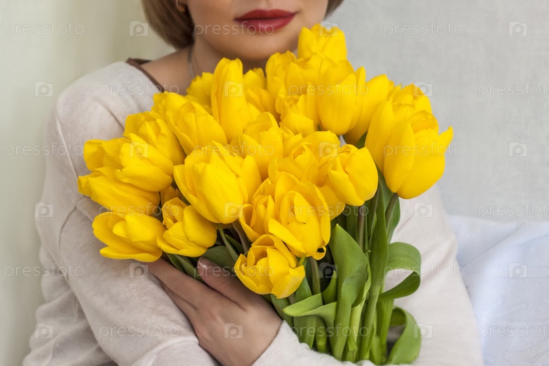 Девушка и большой букет свежих желтых тюльпанов. Концепция весны и праздника, 8 марта, Международный женский день