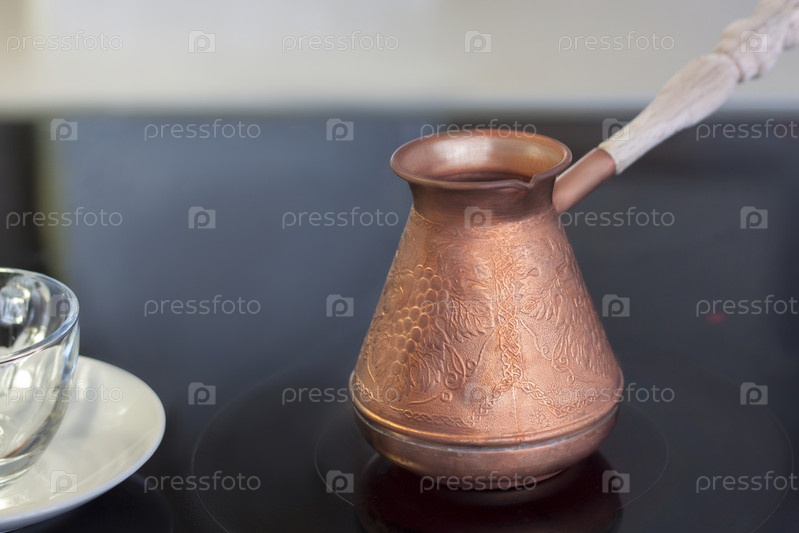 Медная турка для заваривания кофе стоит на стеклокерамической плите. Сварить кофе в турке