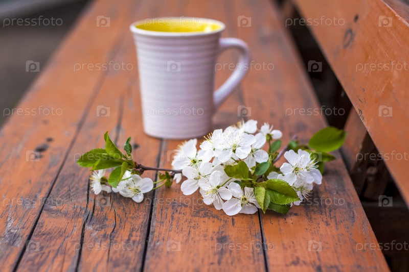 Чашка кофе на темном изношенном деревенском деревянном столе. Композиция украшена веточкой с белыми цветами. Цветы вишневого дерева. Выборочный фокус