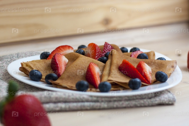 Блины с черникой и клубникой на столе. Традиционная еда на Масленицу