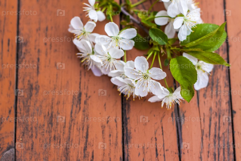 Веточка белых цветов на темном изношенном деревенском деревянном столе. Цветы вишневого дерева. Выборочный фокус
