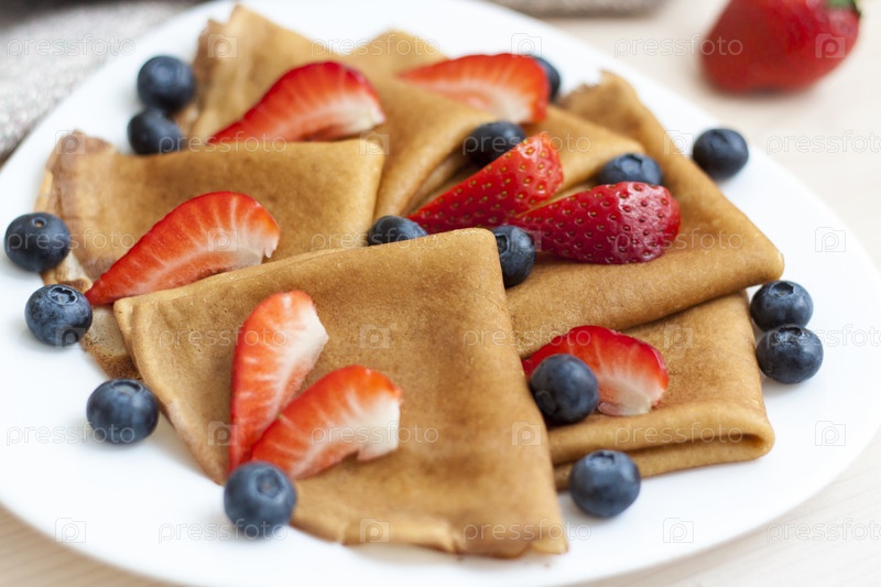 Блины с черникой и клубникой на столе. Традиционная еда на Масленицу