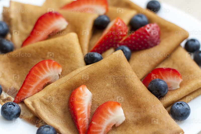 Блины с черникой и клубникой на столе. Традиционная еда на Масленицу