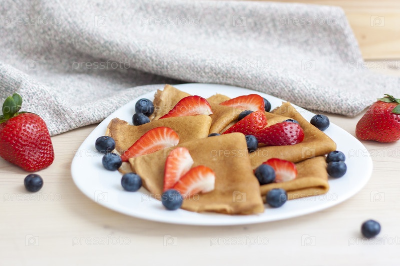 Блины с черникой и клубникой на столе. Традиционная еда на Масленицу