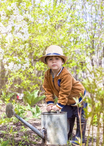 Симпатичный маленький мальчик в шляпе и резиновых сапогах поливает растения лейкой в саду. Очаровательный малыш помогает своим родителям выращивать овощи