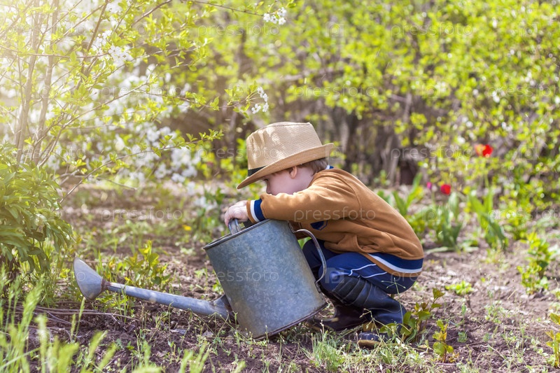 Симпатичный маленький мальчик в шляпе и резиновых сапогах поливает растения лейкой в саду. Очаровательный малыш помогает своим родителям выращивать овощи