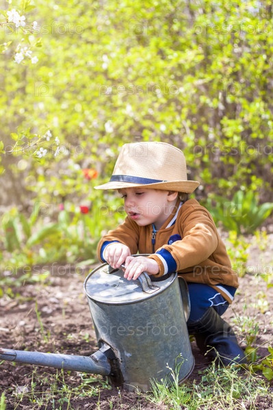 Симпатичный маленький мальчик в шляпе и резиновых сапогах поливает растения лейкой в саду. Очаровательный малыш помогает своим родителям выращивать овощи